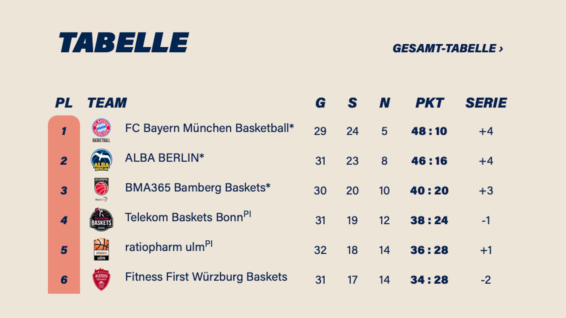 | 3 | BAMBMA365 Bamberg Baskets | 30 | 20 | 10 | 66.67 | 2680 : 2479 | |